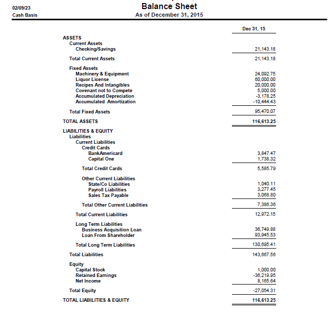 The Balance Sheet shows all your assets, or things that you own, such as your business bank account, your equipment, and your liquor license. This BS has recipes, goodwill, and a covenant not to compete because this business was purchased.